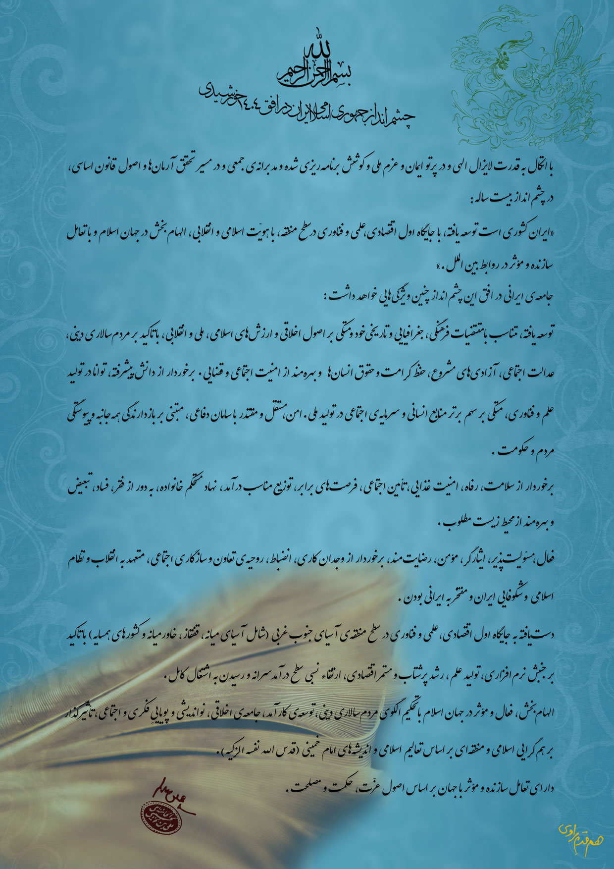 به فضل پروردگار، ملت ایران و کشور عزیز ما مىتواند در طول بیست سال به این آینده برسد. این یک آیندهى مطلوب و یک گام بلند در راه رسیدن به آرمانهاى والاى اسلامى است که در آن، پیشرفت مادى، پیشرفت اقتصادى، پیشرفت فرهنگى، تعالى معنوى و اخلاقى و هویت اسلامى وجود دارد.»